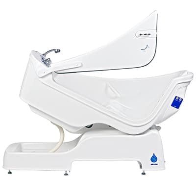 Its most distinctive feature is its tilt and raise capability, allowing caregivers to recline and elevate the bather for optimal cleaning and comfort. During operation, the water in the foot pool circulates to evenly distribute warmth and maintain consistent water temperature—improving both hygiene and relaxation.