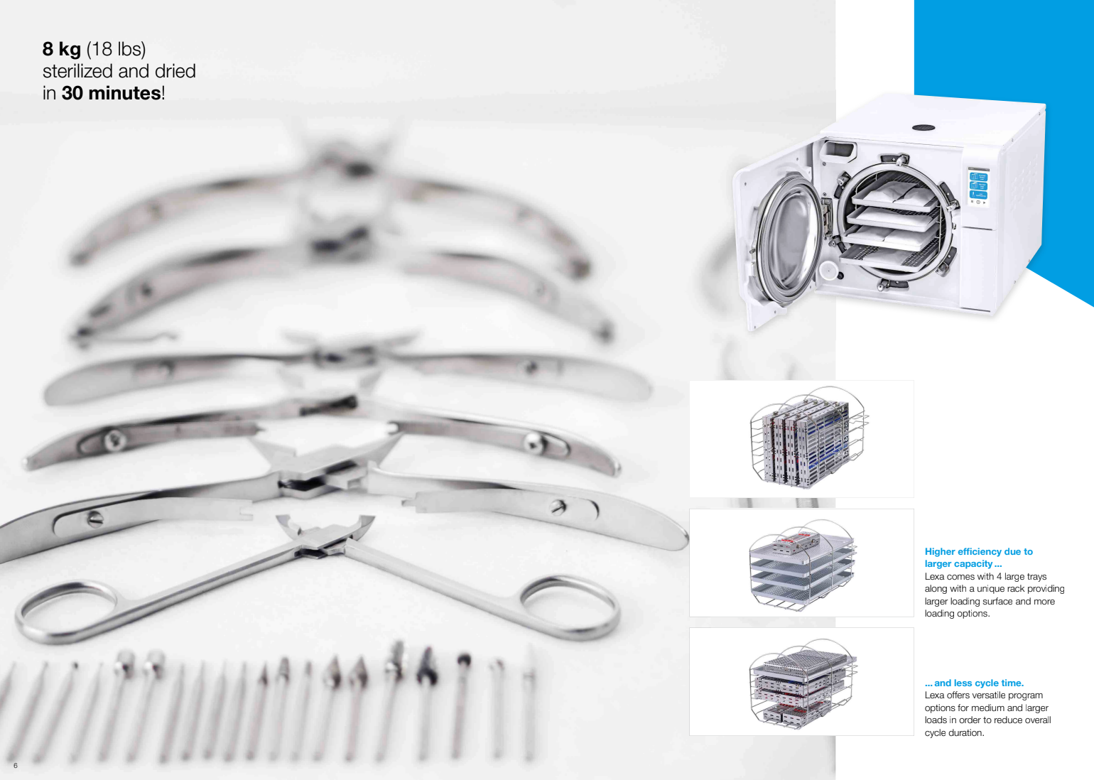 Sterilize and dry up to 8 kg (18 lbs) of instruments in just 30 minutes.